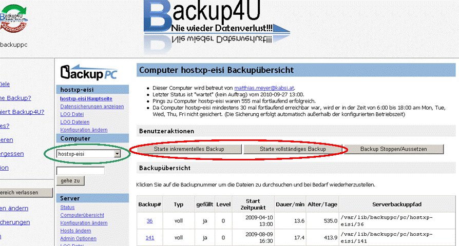 Über den Backup4U Web-Auftritt http://www.backup4u.at kann jederzeit eine manuelle Datensicherung gestartet werden. Zunächst müssen sie Ihren Kundenbereich betreten und sich mittels Eingabe ihrer E-Mail Adresse und ihres Kennwortes authentifizieren. Dann wählen sie links oben (grüner Kreis) den PC aus, den sie sichern wollen. Im Hauptfenster werden dann die Sicherungs-Informationen des ausgewählten PC angezeigt. Sie können nun eine manuelle Datensicherung starten indem sie auf "Starte inkrementelles Backup" oder "Starte vollständiges Backup" (roter Kreis) klicken.